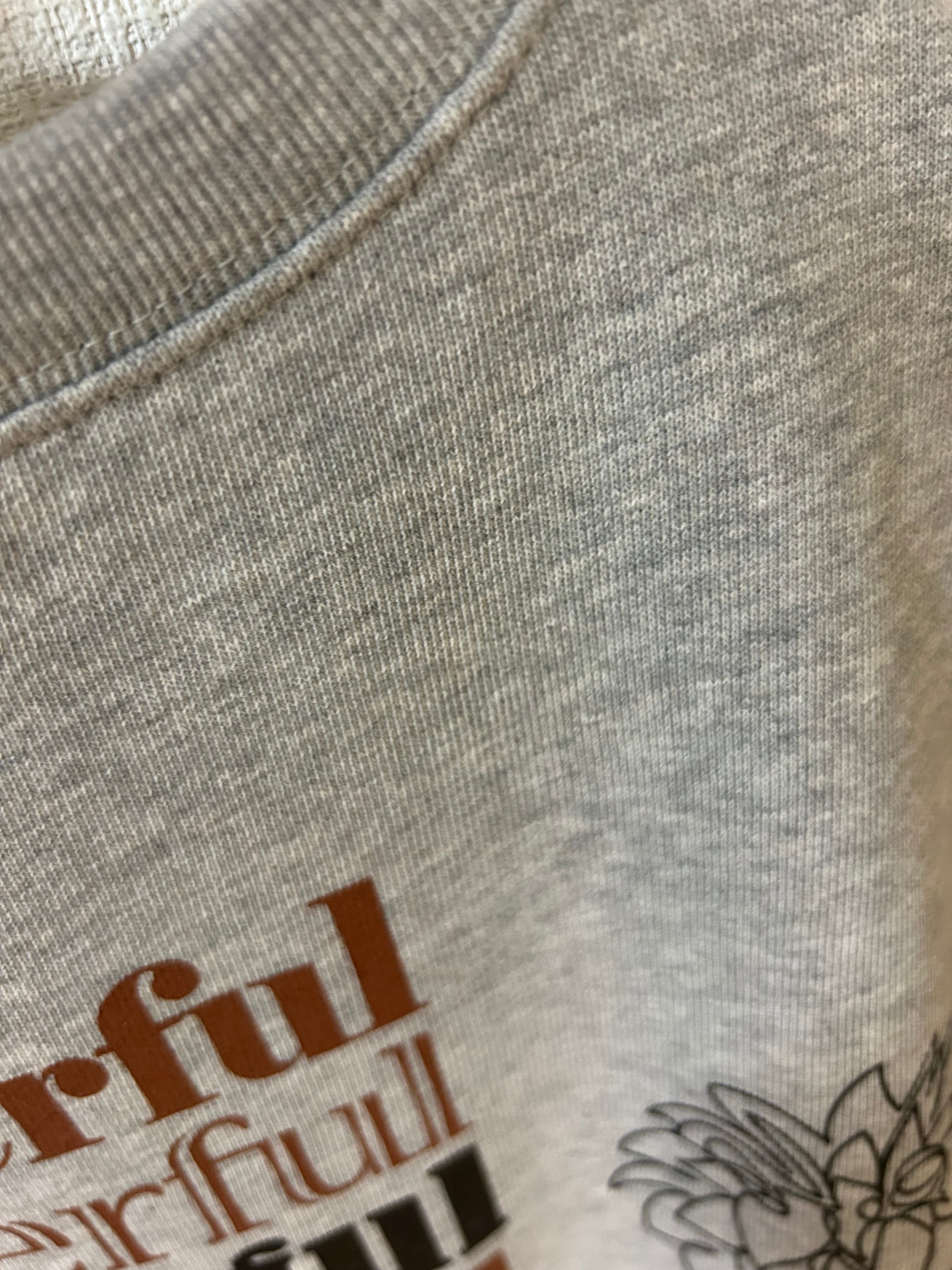 グレーbodyににブラウンのlogoが新鮮です!!兵庫県で花卉栽培に携わる方のダリアの写真にインスパイアされデザインしたスエットです。内側から放つ、淡くも凛々しい美しさをporteらしくポップで華やかに、そして元気に盛り付けました。